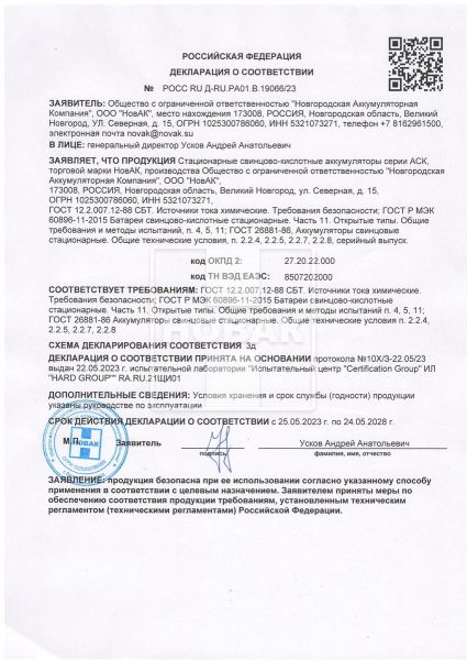 Аккумуляторы производства ООО «НовАК» нашли широкое применение в системах связи, энергетики, на железнодорожном транспорте и других отраслях экономики. Качество и безопасность продукции ООО «НовАК» подтверждается декларациями о соответствии, зарегистрированными в системе сертификации ГОСТ Р.